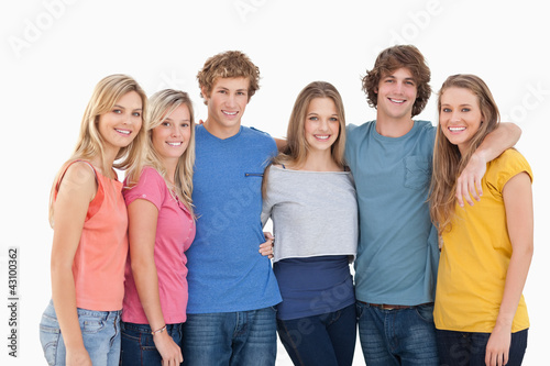 20s, young adult, woman, female, caucasian, man, male, teenage, girl, white background, copy space, background, adult, beautiful, casual attire, cheerful, friends, friendship, fun, photogenic, happiness, happy, smile, smiling, standing, together, togetherness, front view, embracing