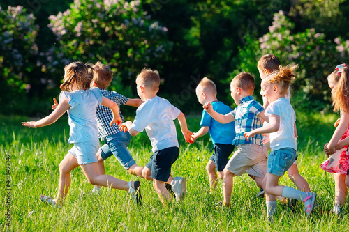 A group of happy children of boys and girls run in the Park on the grass on a Sunny summer day.