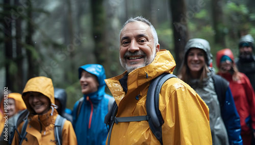 A group of hikers enjoying a rainy day in the forest, all wearing colorful rain jackets and smiling as they explore nature together.