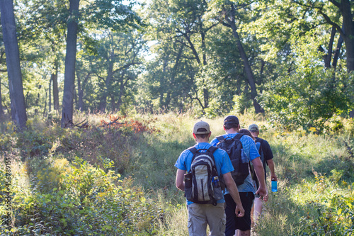 A group of hikers in a sunny forest