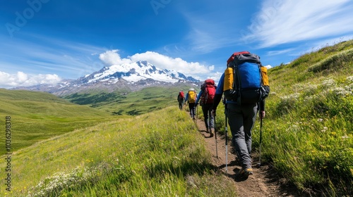 A group of hikers trek through lush green terrain, showcasing stunning mountain scenery under a clear blue sky.