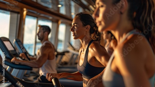 group, people, running, treadmill, cruise ship, exercise, physical activity, fitness, physical exercise, passenger, cardio, healthy, lifestyle, vacation, travel, leisure, wellness, active, health, deck, sea, ocean, motion, gym, sport, athletic, training, running shoe, equipment, fitness centre, maritime, nautical, jogging, treadmill, ship, sail, cruising, sea breeze, recreational activity, endurance, strength