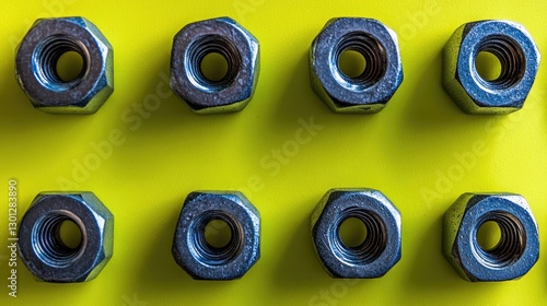 A group of industrial nuts and bolts arranged symmetrically on a vibrant green backdrop.