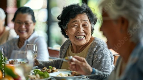 A group of middle-aged female friends chatted happily while eating lunch at a restaurant.