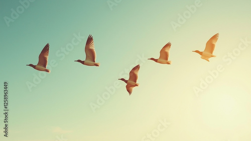 A group of migratory birds flying in a V formation across a clear blue sky, symbolizing unity and nature's beauty