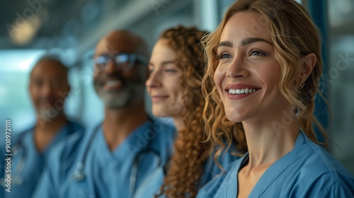 A group of multiethnic male and female healthcare professionals standing in a hospital hallway