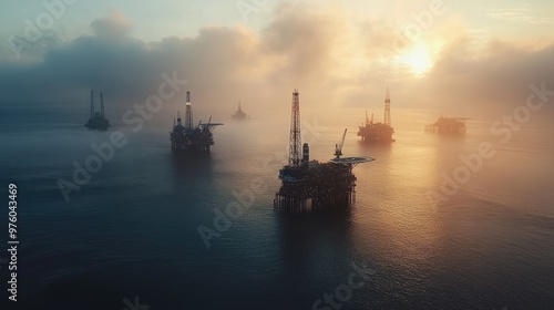 A group of offshore oil rigs are set against a misty ocean backdrop during sunrise, highlighting the scale of industrial energy production on the water.