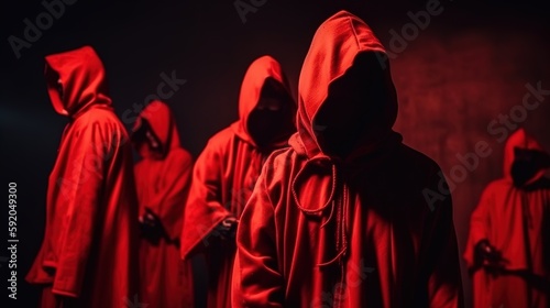 A group of people in red hooded costumes perform a ritual against a dark background. AI generated