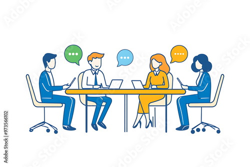 A group of people in suits sits at a table engaged in a discussion about team building. The flat art style emphasizes collaboration and professional teamwork