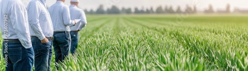 A group of people in white shirts stands in a lush green field, surveying the crops under sunny skies, highlighting agriculture and teamwork.