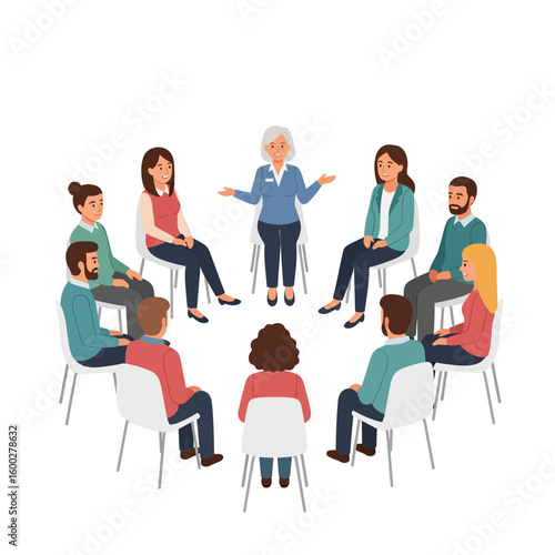 group, circle, people, seated, listening, speaker, support, discussion, session, education, meeting, therapy, advice, conversation, communication, learning, counseling, participant, informal, adult, woman, man, chair, isometric, illustration, attentive, engaged, dialogue, understanding, empathy, sharing