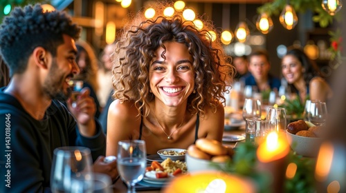 group, people, sitting, table, candle, food, eatery, dining, wine, candlelight, ambience, socialising, friends, smiling, happy, joy, laughter, conversation, dine, meal, relaxation, enjoyment, young, couple, woman, curly, hair, camera, wearing, black, tank, top, necklace, around, neck, man, dark, beard, both, goggles, plate, front, set, bowl, cutlery, background
