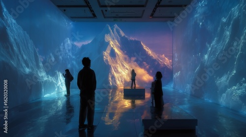 A group of people standing in a large, illuminated room with a dramatic, colorful landscape