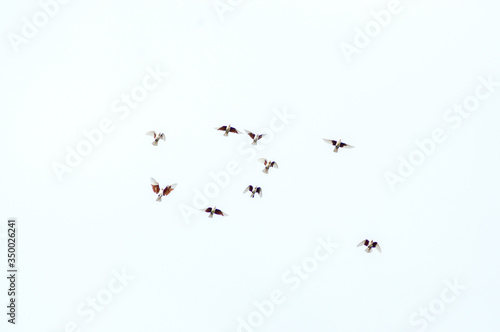 a group of pigeons flies in the sky