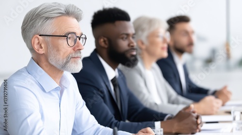 A group of professionals attentively listening during a meeting, showcasing diversity and a collaborative business environment.