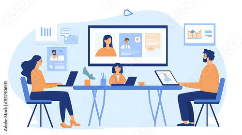 group, professional, video, conference, their, home, office, each, displayed, individual, screen, laptop, act, remote, teamwork