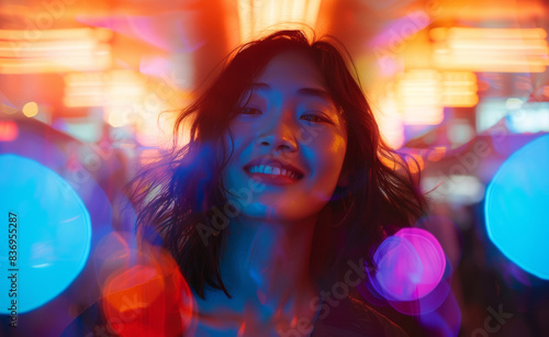A group of smiling Asian women with long hair forms a line against a blue backdrop, illuminated by vibrant spectrum colors and cinematic lighting, with reflective and mirroring effects.