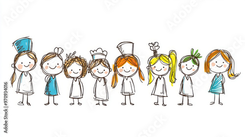 A group of smiling, hand-drawn children wearing various playful outfits, standing in a row with happy expressions and colorful details.