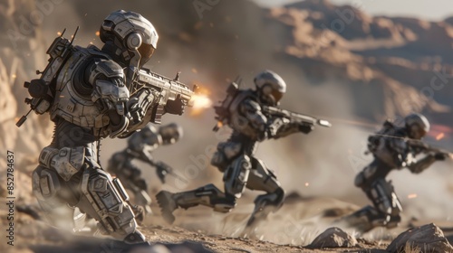 A group of soldiers in space suits are running through a desert, with one of them firing a weapon. The scene is intense and action-packed, with the soldiers clearly in the middle of a battle