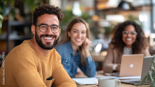 A group of three colleagues is seen smiling and collaborating in a vibrant, modern office space, reflecting teamwork, positivity, and a dynamic work environment.