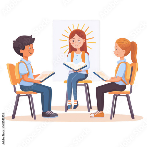 A group of three diverse individuals sitting in a circle, engaging in a discussion with books in hand, set against a bright, cheerful background.