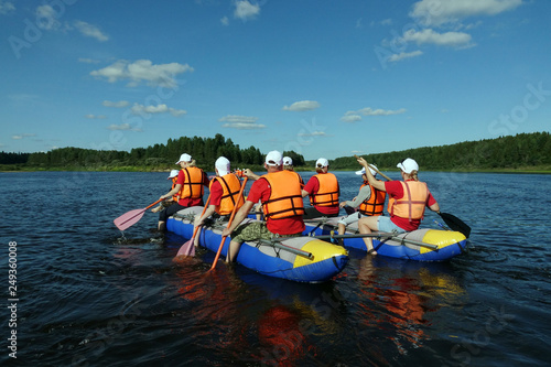 A group of tourists floating on a quiet river on inflatable catamarans, outdoor activities.