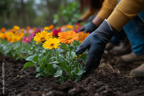 A group of volunteers planting colorful flowers in a community garden. Bright lighting, contrast