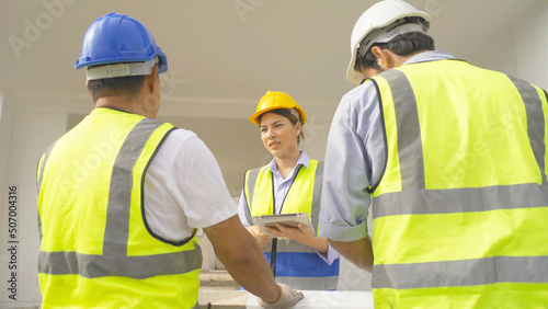 A group of workers, a designer team talk, communicate, discuss, and working on industrial construction site at home architecture building project. People lifestyle.