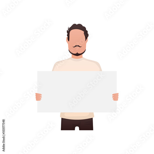 A guy of strong physique stands waist-deep and holds a blank sheet in his hands. Isolated. Cartoon style.
