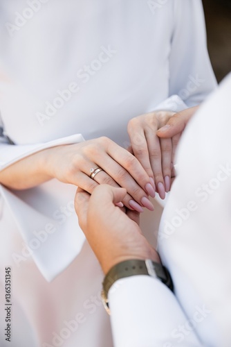 A guy puts a diamond engagement ring on his girlfriend's finger, close-up photo. An offer of a hand and a heart. Wedding ring