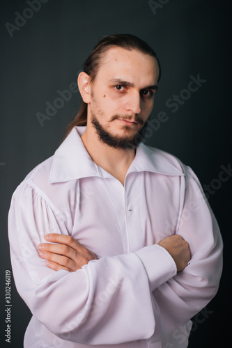 A guy with a beard in a white vintage shirt. Romantic portrait on a gray background