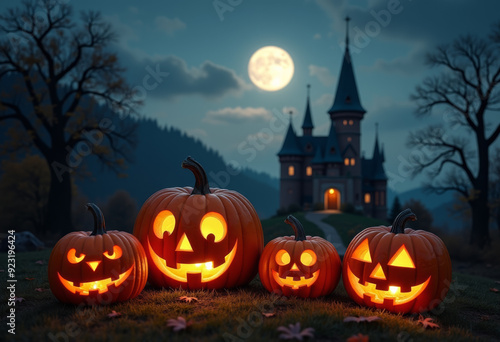 A Halloween scene with pumpkins, a castle and a full moon in the night sky.