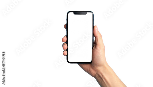 A hand, angled from the right, holds a smartphone. The screen is blank white against a stark black background
