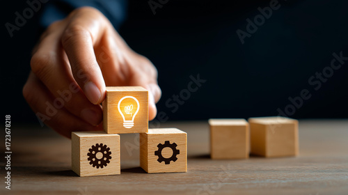 A hand arranges wooden blocks with a lightbulb and gear icon, hyper-realistic symbols of innovation with vivid textures, moody shadows on a table, bright saturation in solution vis