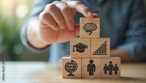 A hand carefully places a wooden block adorned with a brain icon atop a pyramid of similar blocks, each representing concepts like education, growth, and community. This image captures the essence of