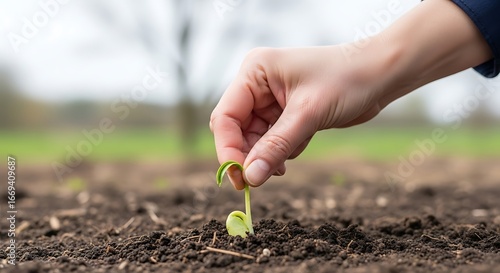 A hand gently places a seedling into the soil.