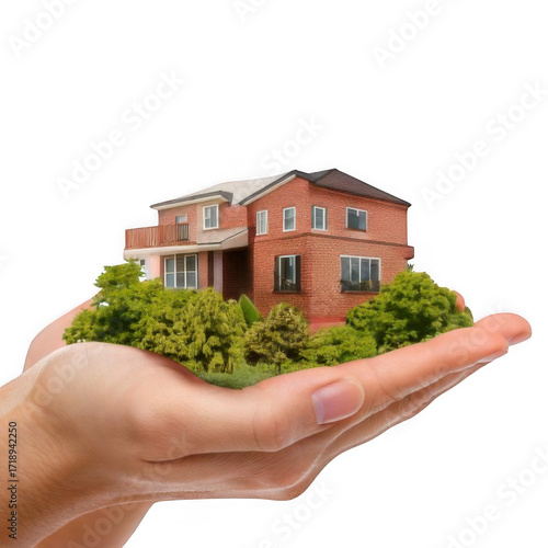 a hand holding a house and building isolated on transparent background, real estate concept