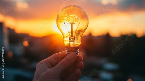 A hand holding a light bulb. Creative energy, Innovation, Bright idea, Sustainability, Inspiration, Light bulb, Sunset creativity, Natural energy, Eco innovation, Golden hour Concept Image.
