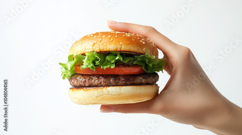 A hand holding a sesame seed bun hamburger with lettuce and tomato.