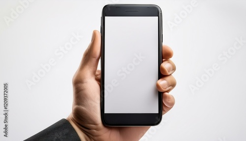 A hand holding a smartphone with a blank screen, isolated on a white background.