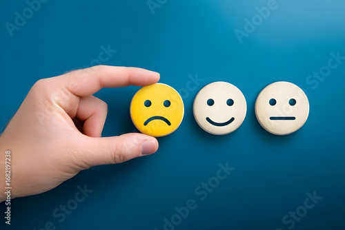 A hand holding a yellow emoji depicting sadness, illustrating a spectrum of emotions with varying smiley faces.