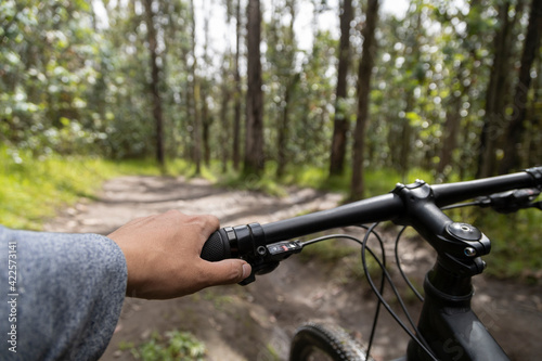 a hand holding the steering wheel of his bicycle, in the background is a path in the middle of the forest on a sunny day, healthy lifestyle