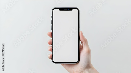 smartphone, mobile, phone, hand, holding, screen, blank, white, background, device, app, technology, digital, contraption, modern, minimal, clean, simple, interface, display, illustration, design, template, presentation, showcase, advertisement, marketing, communication, connectivity, wireless, portable, touch screen, ios, android, website, web, application, software, hardware, electronic, portrait, image, photo, picture, product