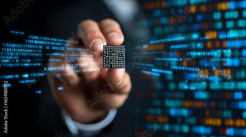 hand, business, suit, holding, ai, chips, binary, code, datum, flowing, technology, digital, innovation, futuristic, circuit, processor, smart, tech, computer, electronic, artificial, intelligence, device, network, connection, system, software, hardware, modern, science, engineering, microchip, information, closeup, concept, abstract, progress