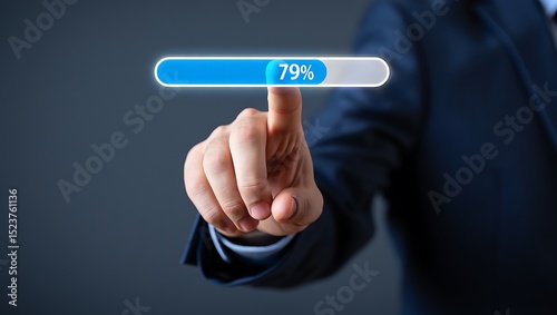 A hand in a suit jacket hovers over a bright blue loading bar at 79 against a dark gray background