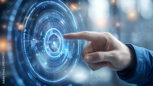 A Hand Interacts with a Futuristic Circular Interface of Blue and White Digital Data, Representing Technological Advancement and Innovation.