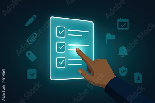 hand, checklist, digital, glowing, task, completion, interface, dark, background, modern, technology, touch, screen, light, graphic, illustration, design, business, productivity, work, virtual, progress, app, list, item, select, beautiful, colourful, bright, creative, elegant, stylish, professional, decorative, vibrant, stunning, amazing, marvellously, fantastic, gorgeous, lovely, charming, attractive, impressive