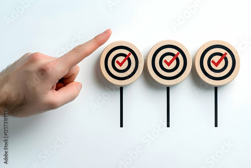 A hand pointing at three targets, symbolizing goal achievement and success in business strategy and planning.