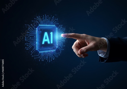 ai, artificial intelligence, technology, innovation, future, futuristic, circuit board, chips, hand, finger, pointing, graphic, glowing, neon, blue, dark, dark background, business, entrepreneur, digital, businessman, computer science, modern, closeup, tech, progress, growth, solution, invention, light, bright, design, graphical, virtual, overlay, technically, conceptual, contemporary, datum, generative, touch