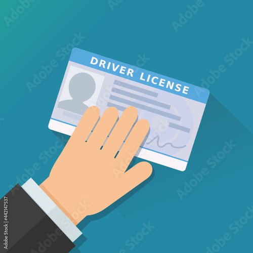 licence, english, hand, driver, car, concept, paper, illustration, vector, id, finger, handle, businessman, identification, signs, symbol, mug shot, blue, identify, picture, id card, blue background, shadow, signature, star